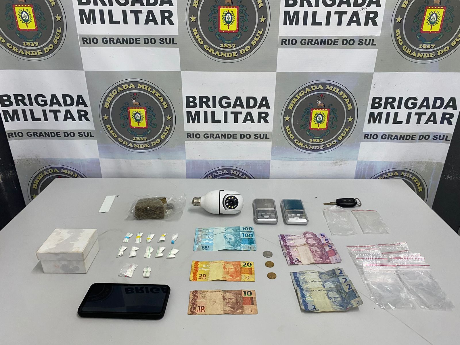 Com o suspeito, os policiais apreenderam 12 porções de cocaína, uma porção de maconha, dinheiro, balanças de precisão, embalagens, um celular, uma câmera de vigilância e um veículo Renault Kwid.