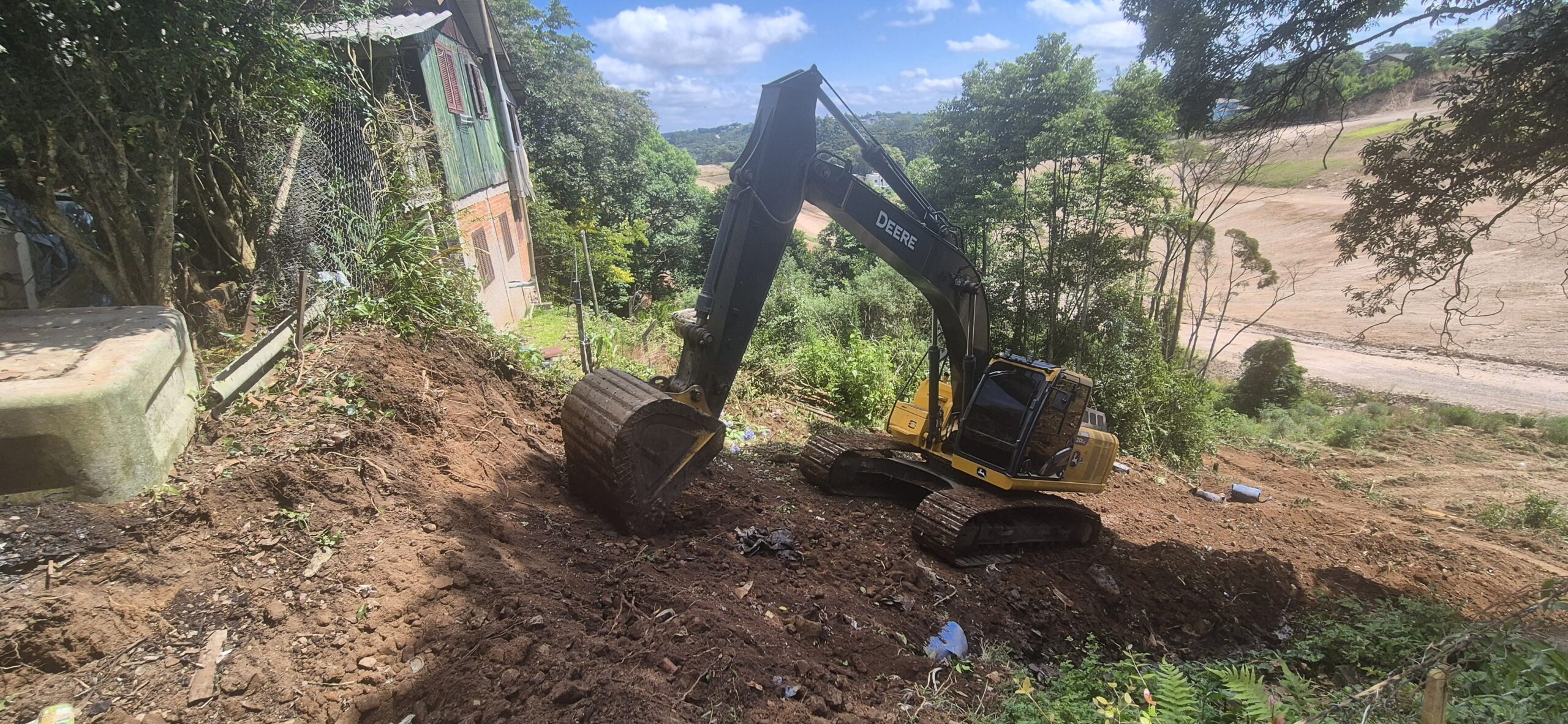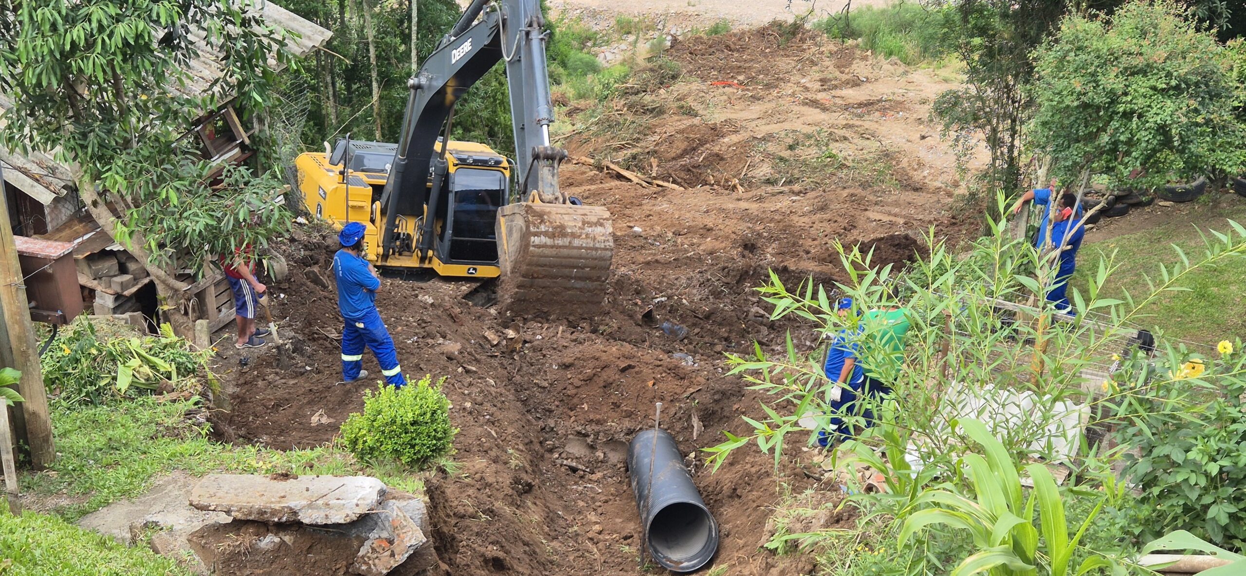 A rede existente encontrava-se danificada e é responsável por conduzir águas provenientes de um ponto elevado até uma cota mais baixa do bairro. O traçado da tubulação cruza áreas entre residências, o que torna o serviço tecnicamente complexo, exigindo atuação em terreno acidentado e de difícil acesso.