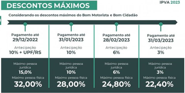Além dos descontos pela antecipação, os proprietários que optarem pelo parcelamento também podem obter os descontos dos programas estaduais “Bom Motorista” e “Bom Cidadão”, se tiverem direito.