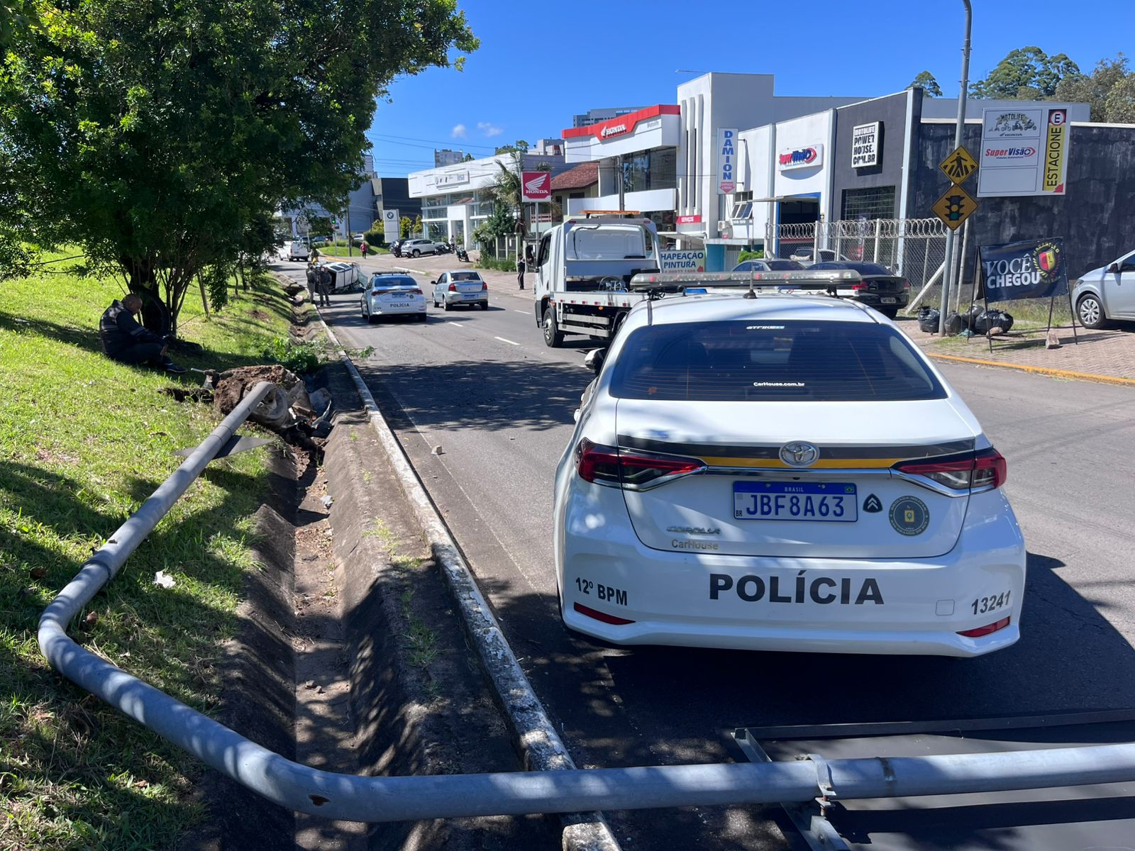 De acordo com informações preliminares, o condutor de um Fiat Palio Weekend branco passou mal enquanto dirigia. O veículo acabou colidindo contra um Volkswagen Up que trafegava pela via e, na sequência, atingiu um poste de sinalização. Após o impacto, a Palio avançou pelo canteiro central por cerca de 15 a 20 metros e tombou.