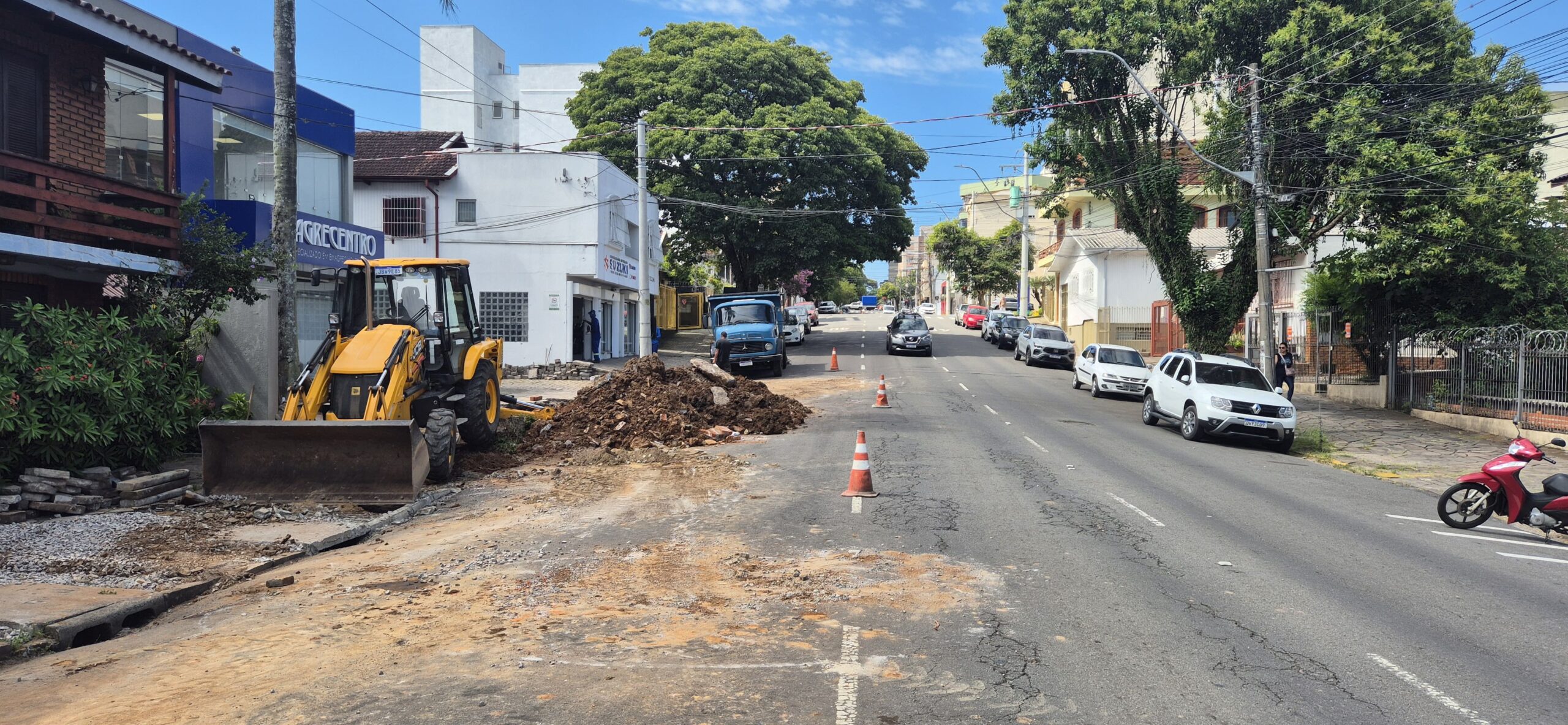 Os trabalhos ocorrem predominantemente na calçada, onde são realizadas escavações e adequações na tubulação existente, com o objetivo de restabelecer e garantir a eficiência no escoamento das águas pluviais. Em razão da movimentação de terra, do uso de maquinário pesado e da circulação de caminhões, foi necessária a interdição temporária do estacionamento e de uma das faixas da via, utilizada para manobras operacionais durante a execução dos serviços.