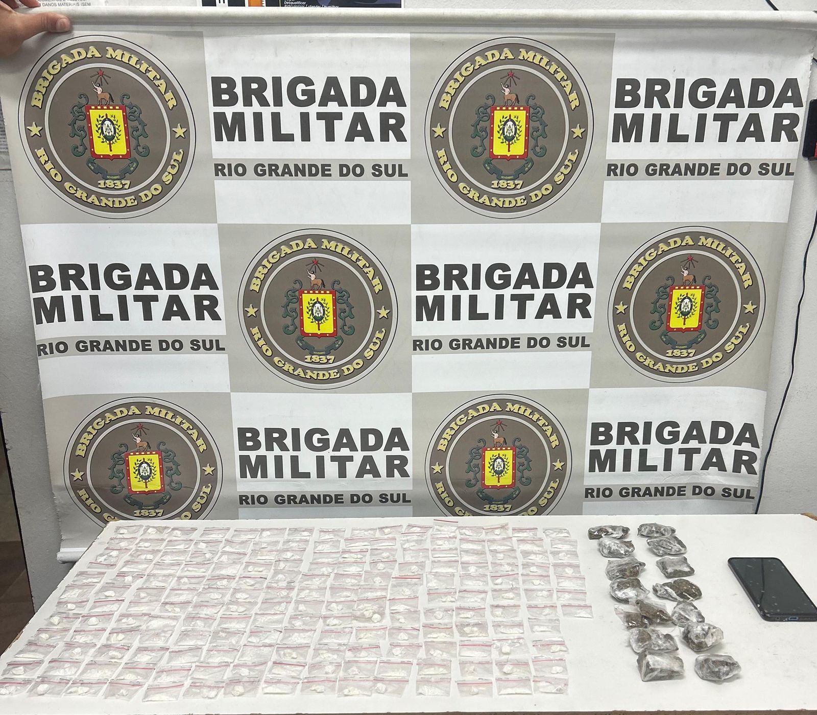 Conforme o Pelotão de Força Tática da Brigada Militar, a abordagem ocorreu no bairro Industrial. Na revista ao veículo, foi localizada uma sacola amarela contendo 15 porções de maconha e 183 porções de cocaína.