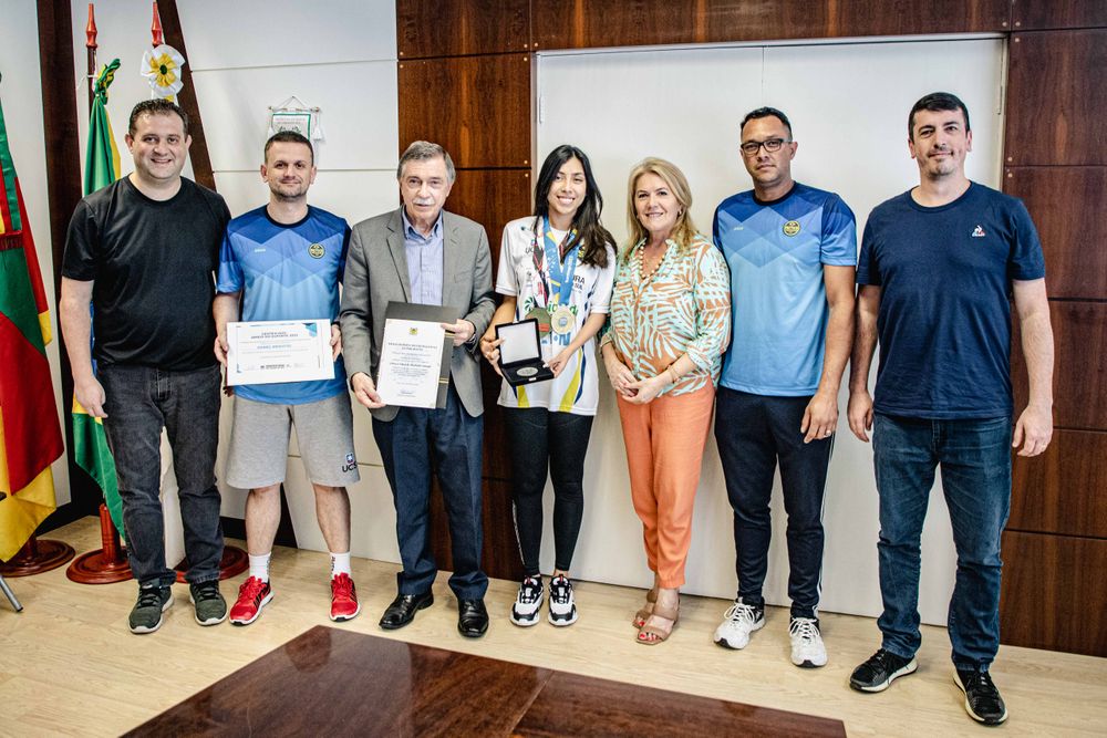 A paratleta caxiense de taekwondo da ACTKD/UCS, Maria Eduarda Machado Stumpf, recebeu a Medalha Monumento Nacional ao Imigrante. A maior honraria do Município foi entregue na quarta-feira (29), pelo prefeito Adiló Didomenico e pela vice-prefeita Paula Ioris, junto com o secretário municipal do Esporte e Lazer, Gabriel Citton, em reconhecimento às conquistas obtidas por ela na modalidade. Também estiveram junto no encontro o gerente do Esporte e Lazer, Vinícius Piazza e o pai da atleta, Ronaldo Stumpf. Na oportunidade, Daniel Brisotto, técnico que acompanha Maria Eduarda, recebeu um certificado de Amigo do Esporte, pelo empenho, destaque e representatividade do Município no taekwondo.