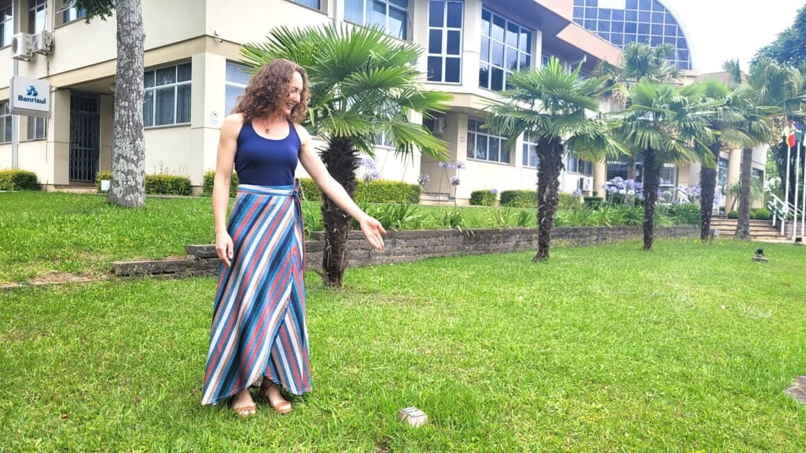 Camila explica que um dos marcos geodésicos foi instalado ao lado do Centro Administrativo e outro próximo aos reservatórios de água, no Loteamento Industrial e Comercial.