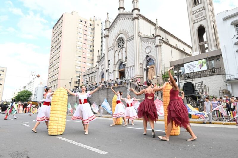 O último desfile cênico da Festa Nacional da Uva ocorre neste domingo (8), em Caxias do Sul, encerrando a programação da edição deste ano do evento. A apresentação ocorre a partir das 16h, na rua Sinimbu, no centro da cidade, com acesso gratuito ao público.