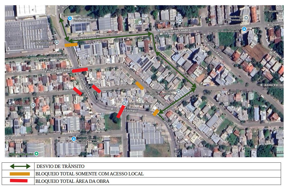A Rua Jacob Luchesi, no bairro Santa Lúcia, em Caxias do Sul, terá bloqueio total ao tráfego de veículos neste sábado (27), a partir das primeiras horas da manhã. Conforme a Prefeitura, a intervenção é necessária para a implantação de uma travessia de rede de drenagem pluvial no trecho localizado entre os cruzamentos com as ruas Altino Veríssimo da Rosa e Estrada Municipal Pedro de David.