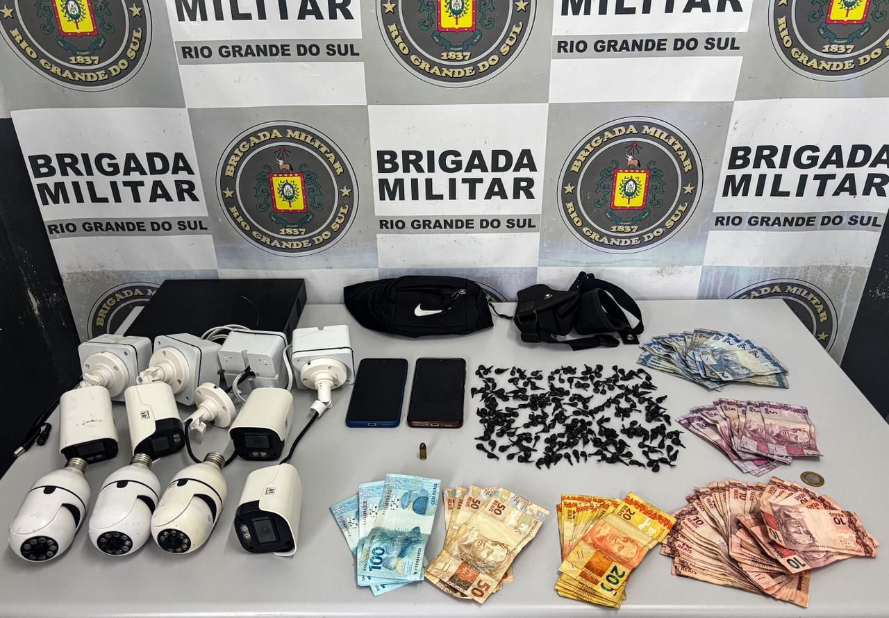 Com os presos, o Batalhão de Polícia de Choque apreendeu R$ 2.169, dois celulares, sete câmeras de segurança, um DVR, um coldre de arma de fogo, 202 pedras de crack e uma munição calibre .380.